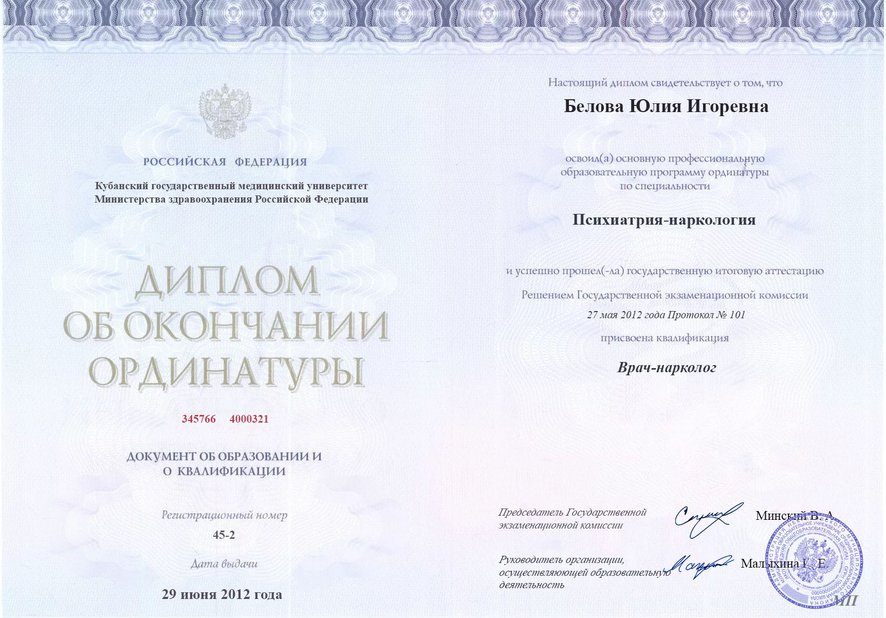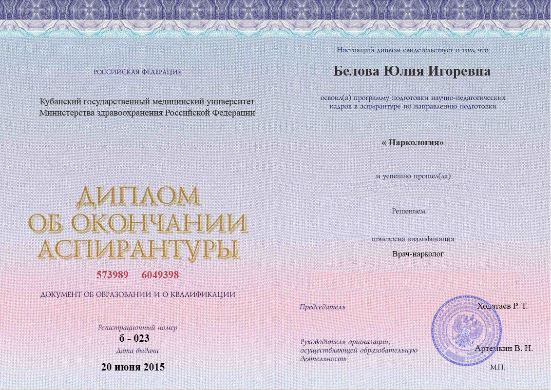 - Переподготовка и повышение квалификации в Кубанском государственном медицинском университете по направлению лечения зависимостей от химических веществ.