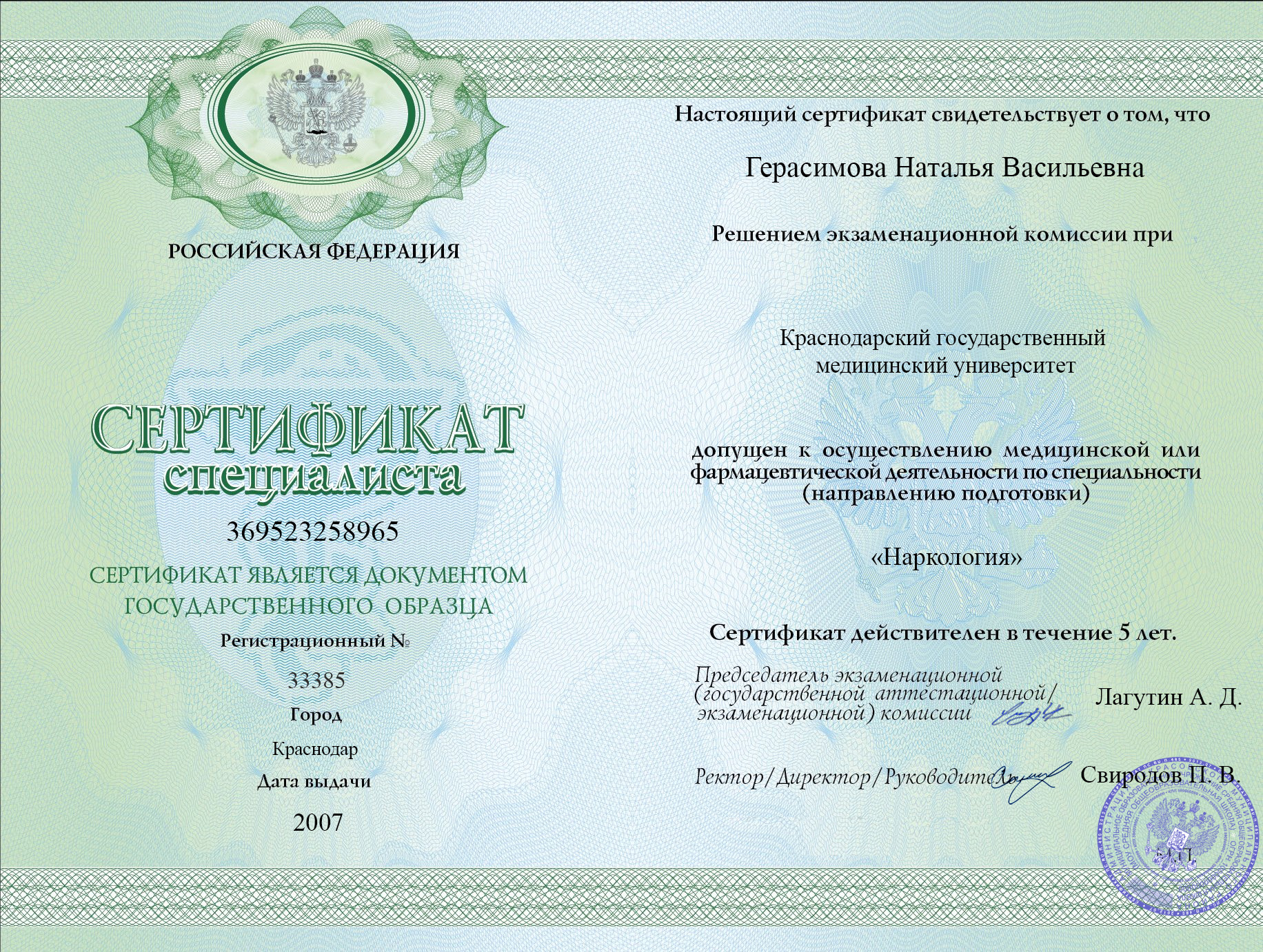 Диплом специалиста Герасимовой Натальи Васильевны