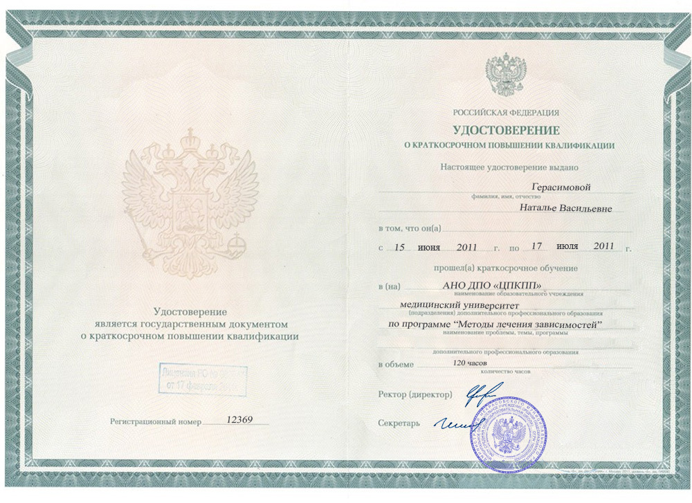 Удостоверение квалификации Герасимовой Наталье Васильевны