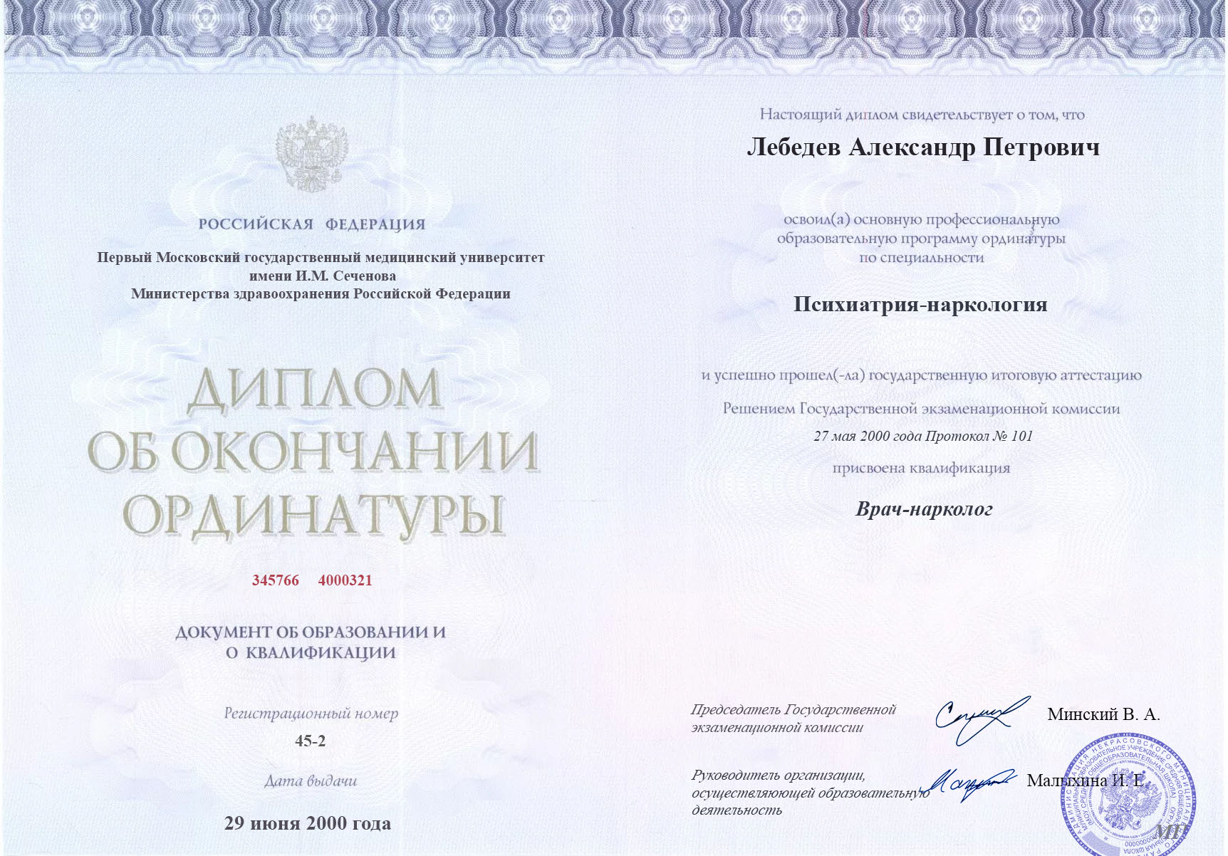 Диплом об окончании ординатуры Лебедева Александра Петровича