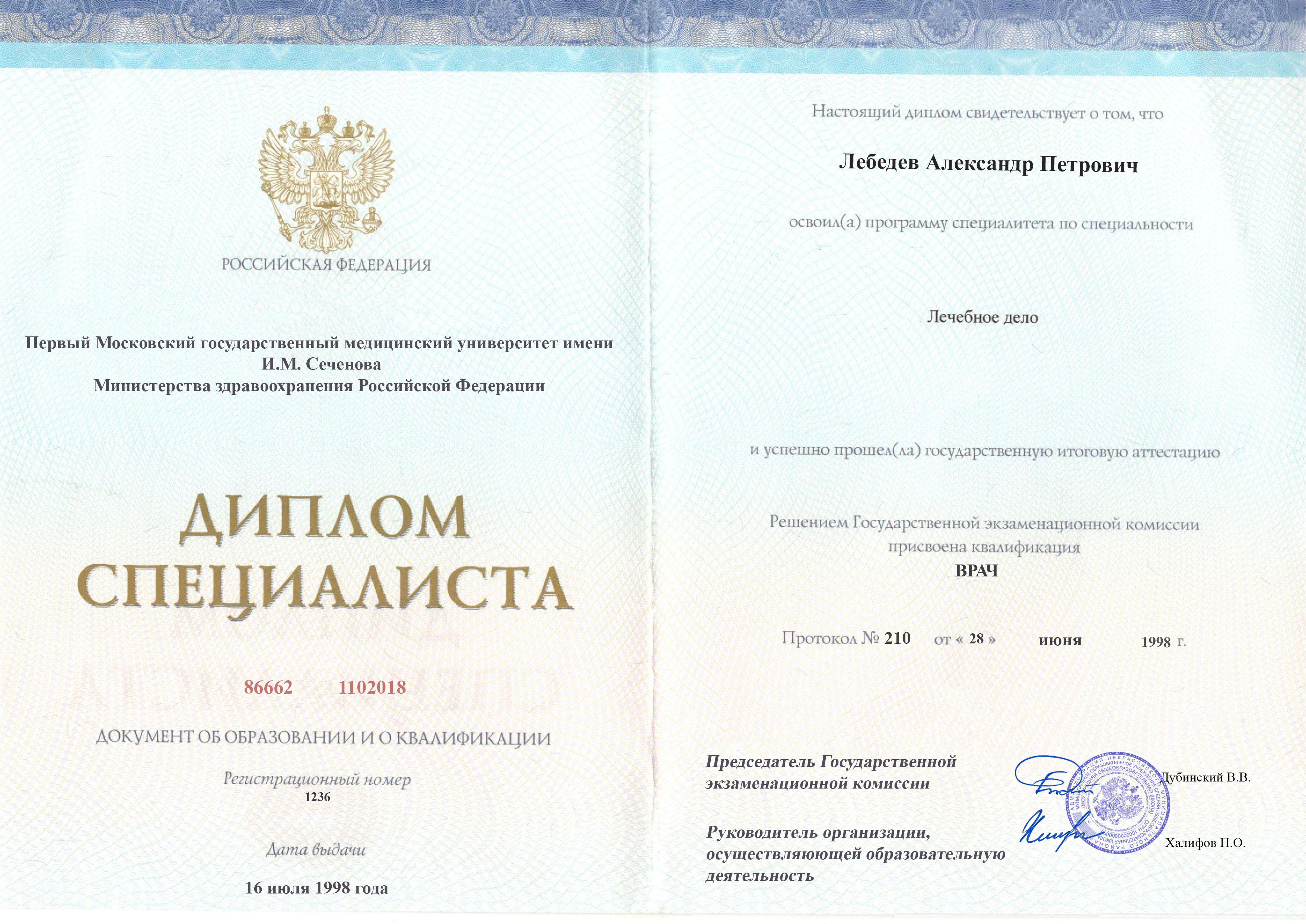 Диплом специалиста Лебедева Александра Петровича