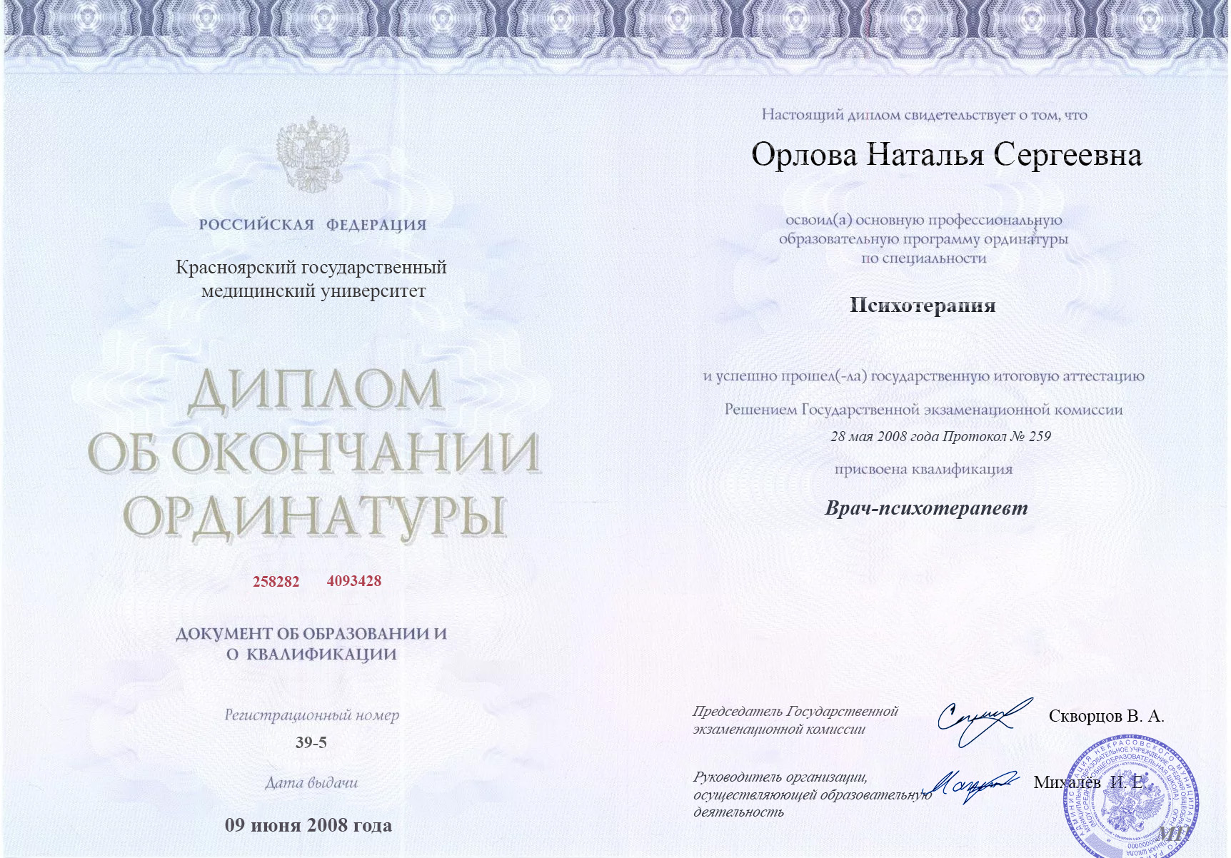Наталья Сергеевна Орлова — опытный врач-психотерапевт, специализирующийся на лечении зависимостей. Окончила Красноярский государственный медицинский университет в 2005 году по специальности «Лечебное дело». В 2008 году окончила ординатуру по психотерапии, а в 2013 году переподготовку по наркологии.